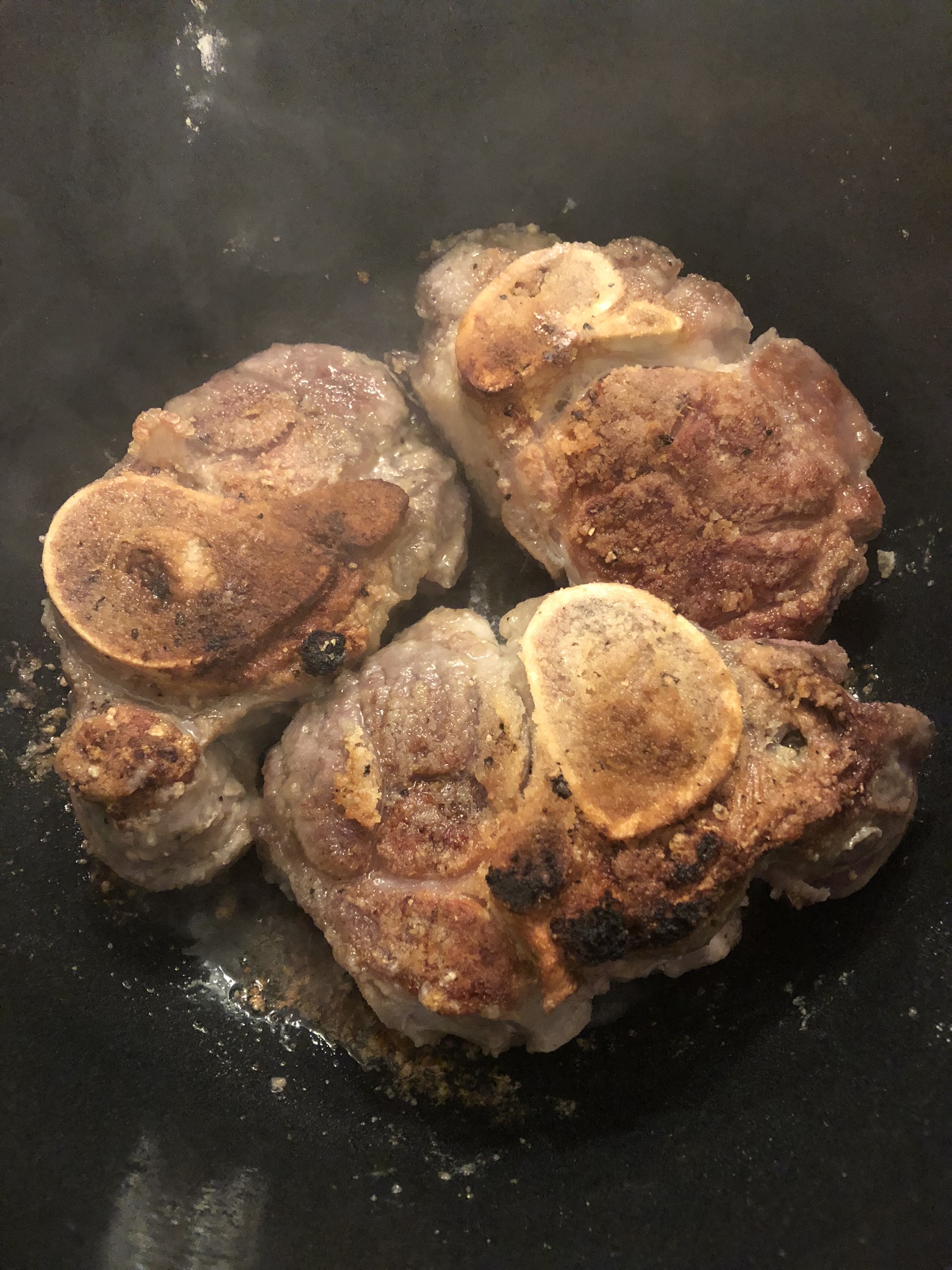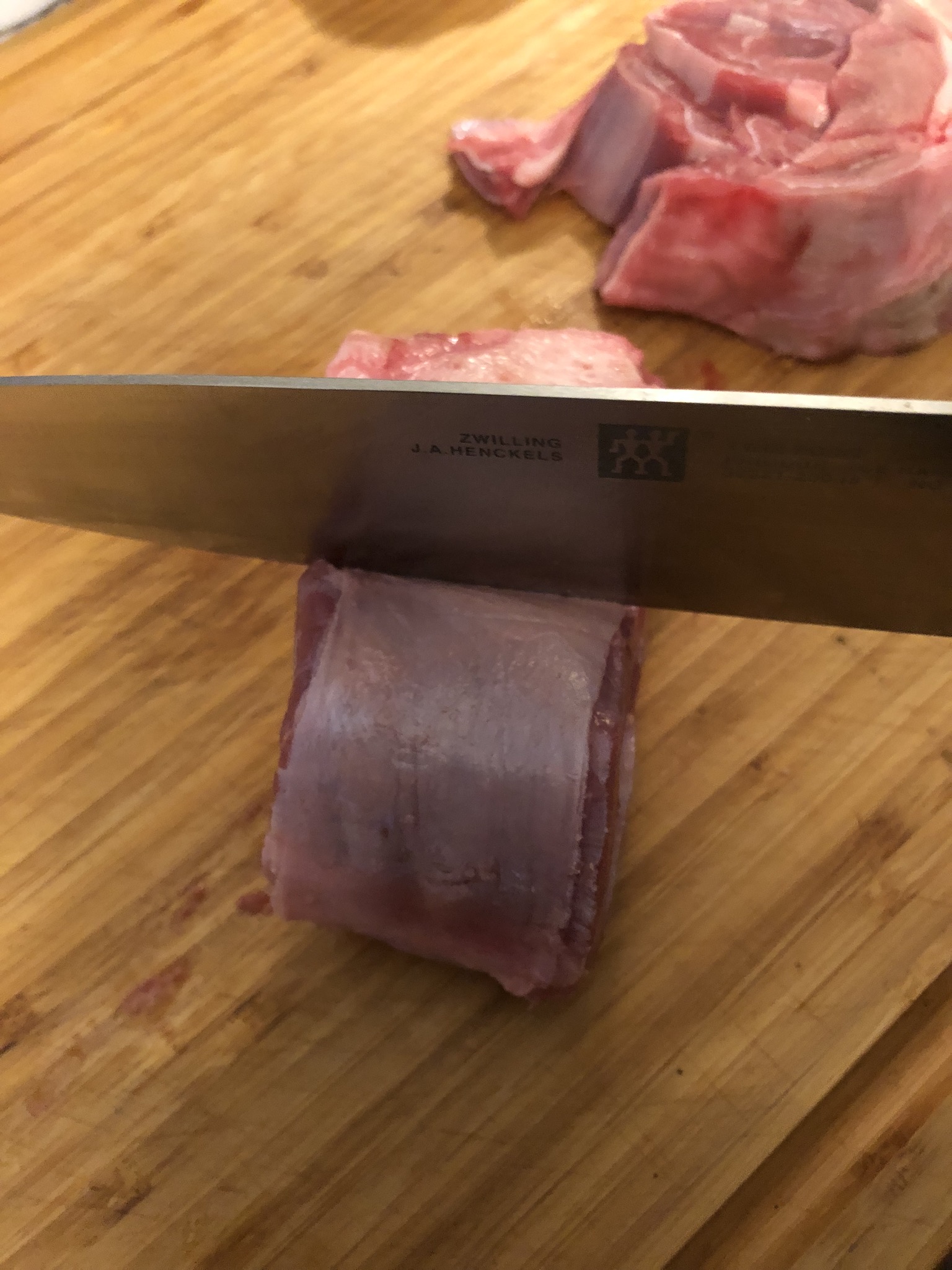- Die Ossobuchi rundum einschneiden. Zwischenzeitlich einen Schmortopf * aufheizen und das Butterschmalz darin erhitzen.