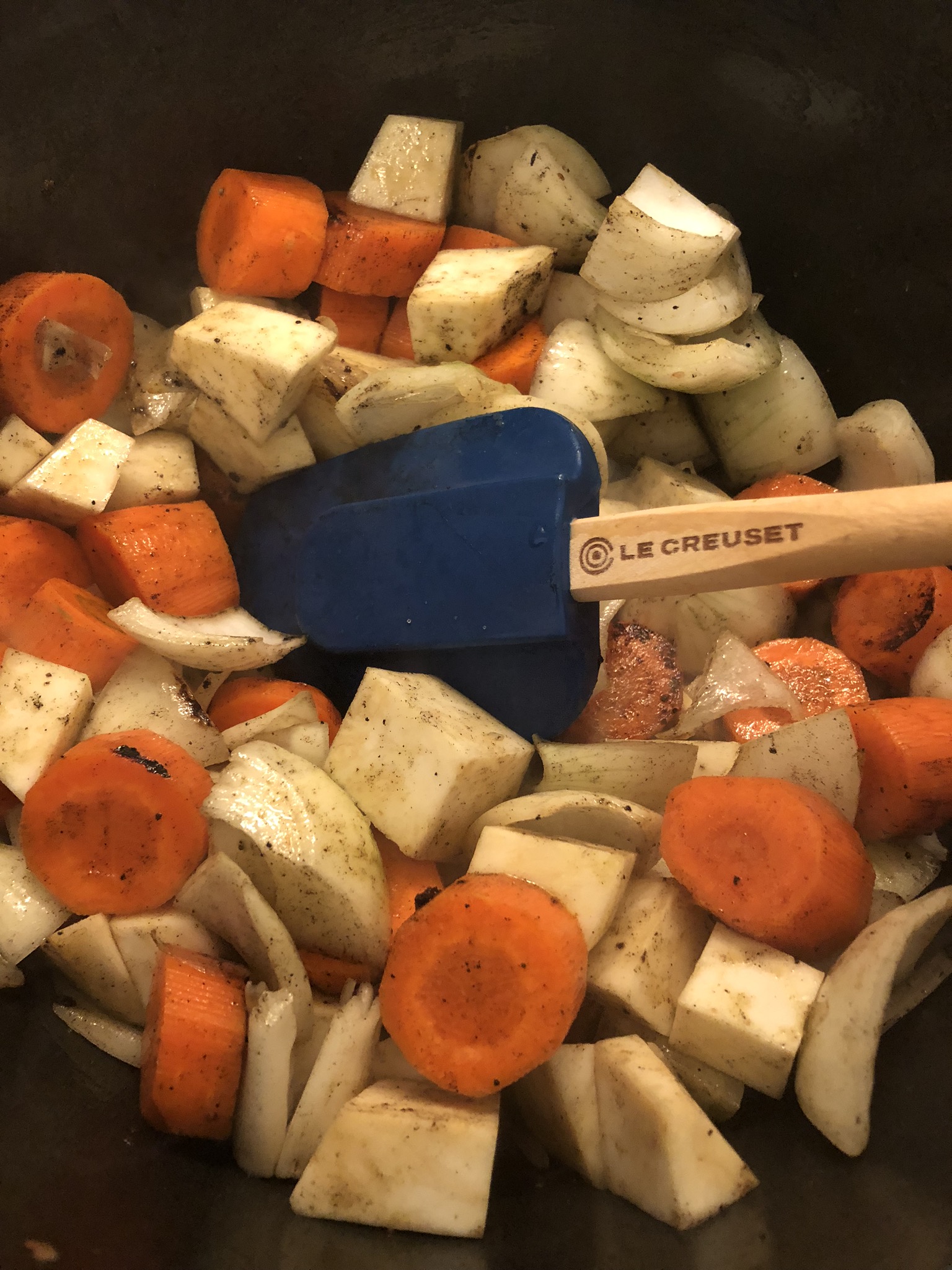 - 300g Mirepoix (150g Zwiebeln, 75g Sellerie und 75g Karotten in Nussgröße geschnitten)