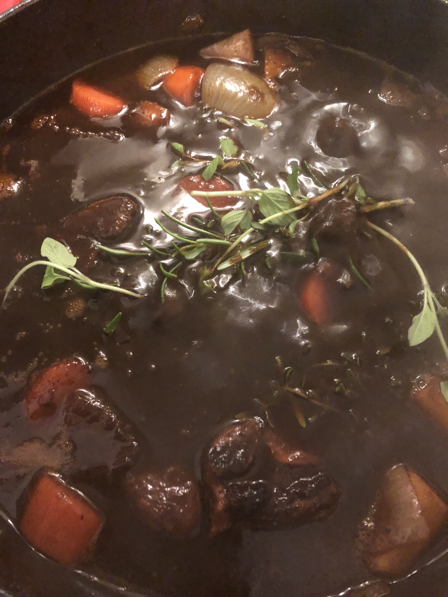 - Mit dem Kalbsfond oder der Demiglace angießen, die Ossobuchi zugeben und aufkochen lassen. Die Beinscheiben müssen komplett mit Sauce bedeckt sein. Die Gewürze zugeben und anschließend den Deckel schließen und etwa 2 bis 3 Stunden bei 140°C im Ofen weich schmoren.