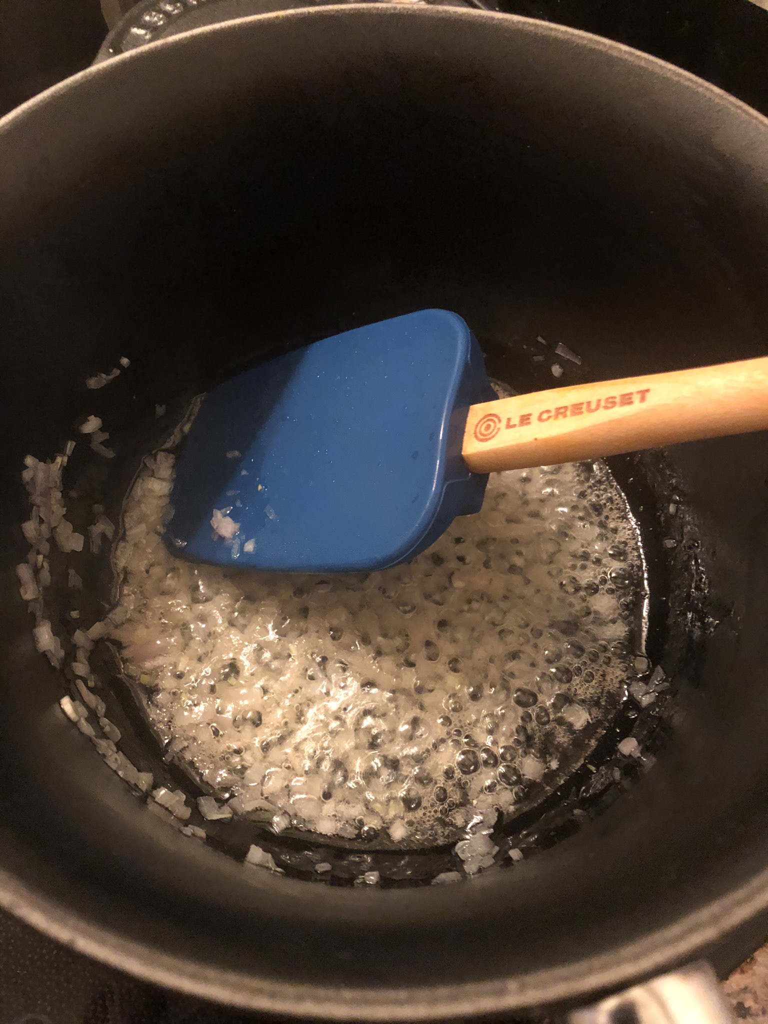 • Jetzt gießt man den Weißwein an und lässt diesen unter ständigem rühren vollständig verkochen.