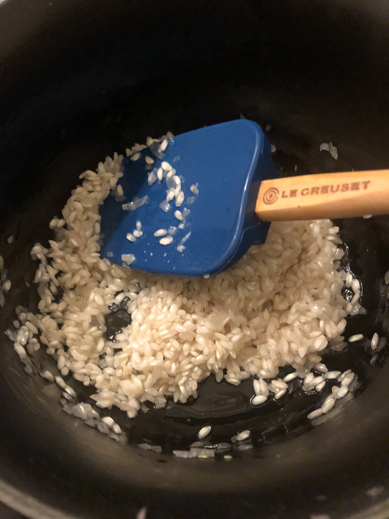 • Anschließend den Risottoreis zugeben und mitrühren, bis dieser komplett vom Fett umschlossen ist und ebenfalls glasig aussieht.