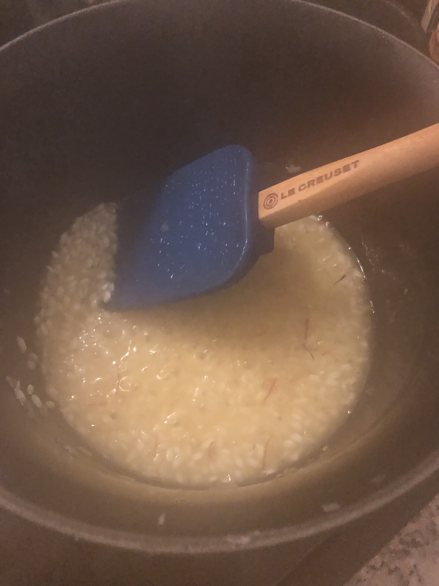 • Nun gibt man den Safran dazu und gießt mit etwa 500 ml der heißen Bouillon an.